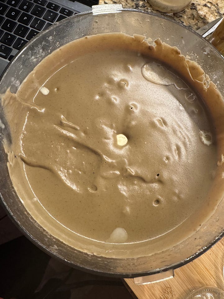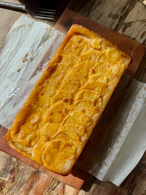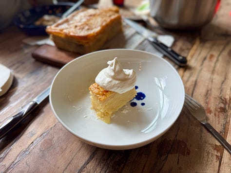 More riffs on ginkgo and pawpaw, more cribbing of other people’s ideas. I went out to see Tama and brought her a French apple gateau. This ATK recipe is goated. It is written for non-bakers who don’t like anything too sweet, so of course it was the perfect gift for an Asian auntie from an aspiring one. It’s basically messy slices of apple loosely shellacked together with pancake batter. The thing that takes the longest time is peeling and mandolining the apples, and you can do that while watching Bon Appetit Your Majesty.3 The only thing I changed in this recipe was omitting vanilla and adding the pulp of one large pawpaw and some grated ginger to the batter. So fragrant. If you make this, the whipped cream is a MUST.