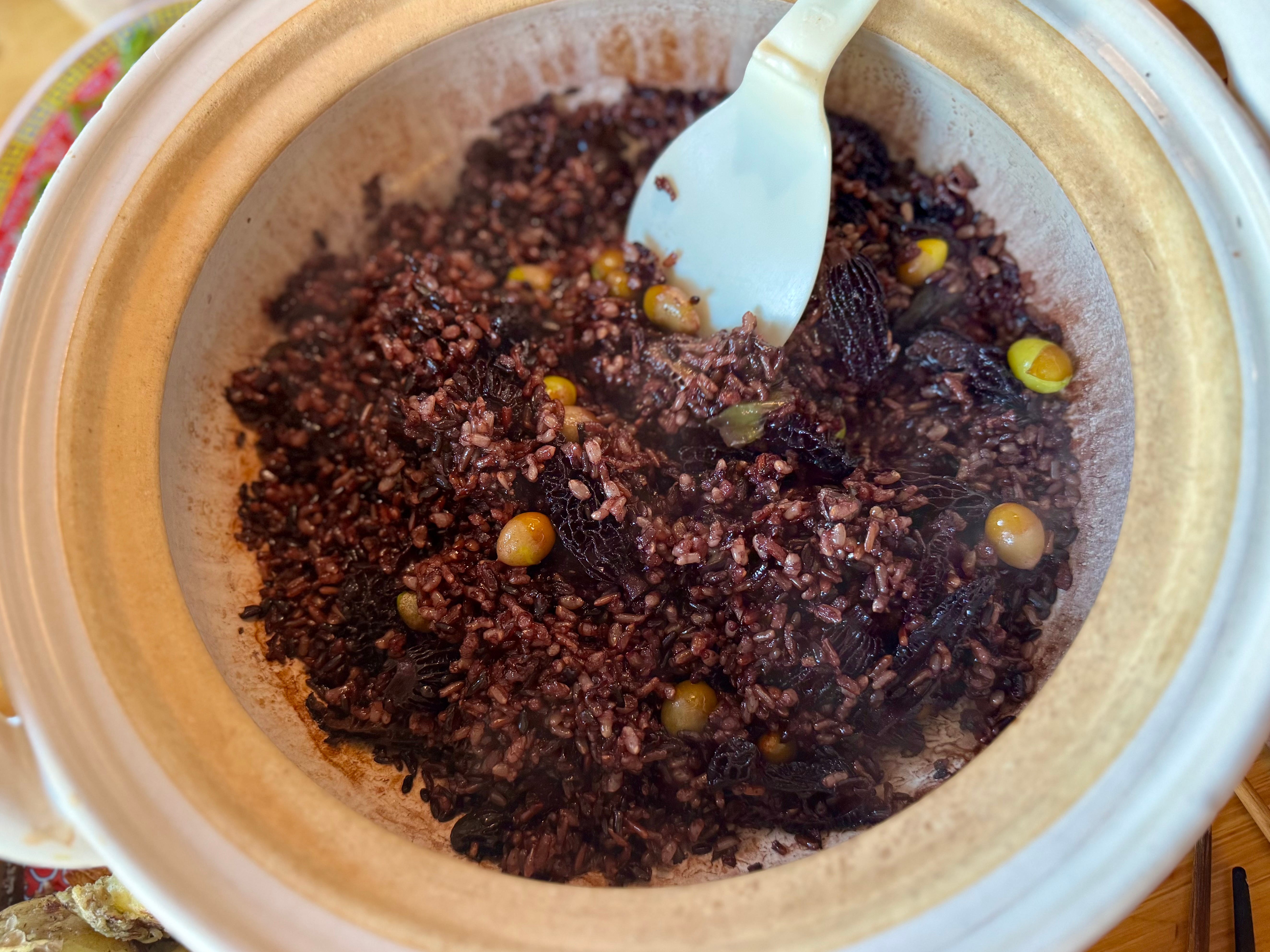 Here’s the formula: rice, any kind. Fresh or rehydrated mushrooms, any kind (but fancy ones are worth it). Stock, any kind (mushroom soaking water will do). Slivered mild green chile pepper, such as longhorn or cubanelle or even shishitos. A mix of light and dark soy sauce (at least 2 tablespoons for a cup of rice). DUCK FAT. Throw it all into an earthenware pot, the duck fat generously globbed on top, and cook until rice is toasted on the bottom. Add roasted ginkgo nuts at the end and mix it all together.