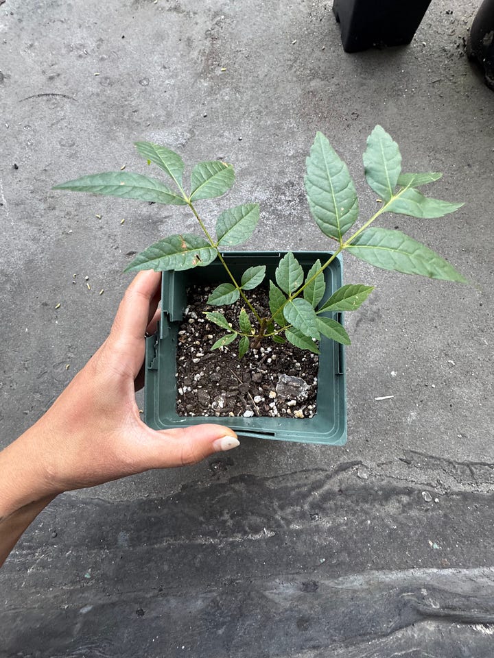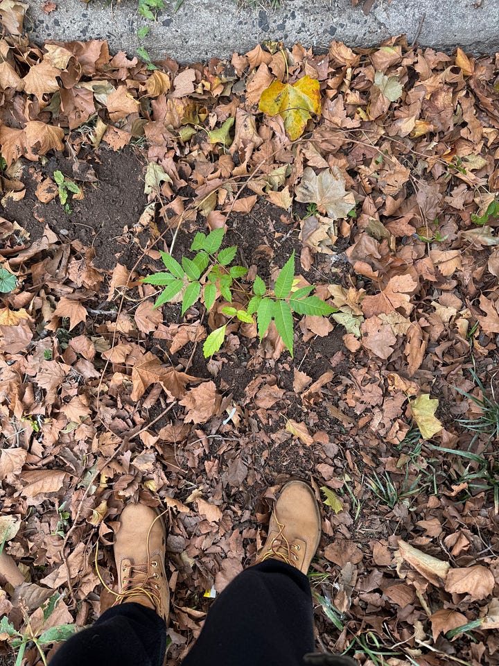 Yes, years of foraging feral toon and now I have my very own sproutling to tend to. Of course, I still live in a Brooklyn apartment, so this became an exercise in guerilla gardening, which I guess I’m long overdue for. My precious is planted in a public park near my apartment, camouflaged amongst tree of heaven (lol). I snuck out at dawn to plant it, mostly because I actually live in a very Chinese neighborhood so I don’t want anyone else clocking this baby. The ground was still loose and soft.