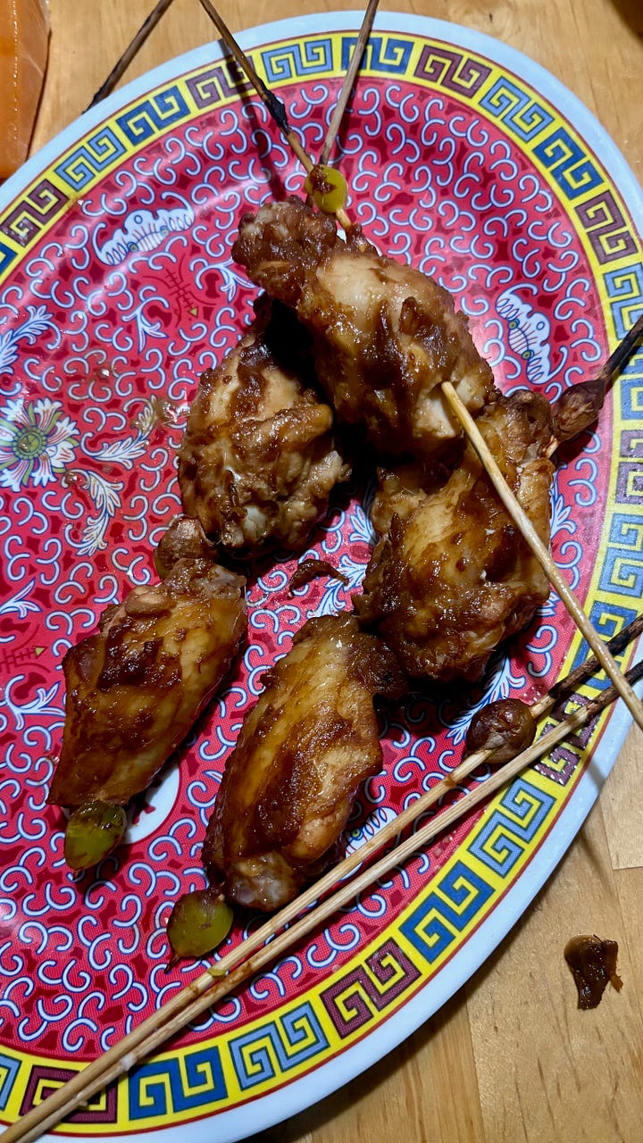Early on, though, I made round after round of pawpaw glazed rotisserie quail. In the 24-hour marinade: pawpaw pulp, shallots, ginger, lemongrass, dark soy, brown sugar, five spice powder, and splashes of last year’s pawpaw vinegar. For my Mid-Autumn Festival party, I did the same marinade on chicken wing skewers threaded with roast ginkgo. I would have slapped these on the grill but it was raining. Next year, I will also commit to making guests gnaw on quail - you need that gaminess for such an aromatic marinade. Serve with a wedge of lime and a little chili pickle.